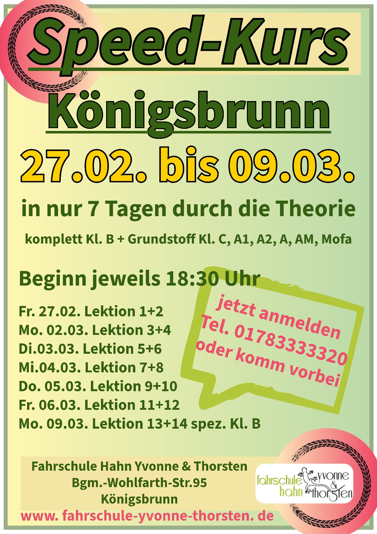 Wir bieten zu unterschiedlichen Terminen in unseren Fahrschulen in Königsbrunn, Haunstetten und Kissing Speedkurse an.
